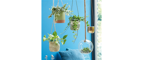 Alles Gute kommt von oben – das trifft auch auf den Efeu zu. Als Hängepflanze sorgt auch er für gute Luft. Als natürliche Klimaanlage filtert er die Raumluft und reguliert die Luftfeuchtigkeit für ein rundum angenehmes Raumklima. Sein Gattungsname „Hedera“ hat den Ursprung im Griechischen und lässt sich vom Wort „hedra“ für „sitzen“ ableiten, womit die Haftwurzeln des Efeus gemeint sind, die der Pflan-ze Halt geben. Der lateinische Name „helix“ bezieht sich auf seine windende Wachsform. Efeu bevorzugt einen hellen Standort ohne direkte Sonneneinstrahlung. Generell gilt die Regel: Je heller die Blätter des Efeus, desto heller kann die Pflanze stehen. Gießen Sie ihn regelmäßig und besprühen Sie das Laub ab und an mit lauwarmem, kalkarmem Wasser, da die Pflanze keine trockene Luft verträgt.